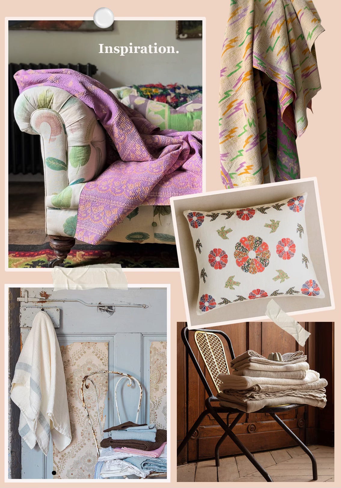 With Spring just around the corner I’m embracing the warmer, sunnier days with a few changes at home. Nothing major – a lick of paint in the bedroom, a vintage Kantha quilt on the bed to replace the winter duvet and some new tea towels in the kitchen. The moodboard, top includes some favourite finds and vintage quilts, like the one I have from Kantha Studio. Made from reclaimed fabrics these beautiful vintage throws and quilts are all hand crafted, intricately stitched, and specially selected in India by mother and daughter duo, Poppy and Lizze. The damson coloured quilt (shown top left) forms part of their new collection at Kantha Studio online.