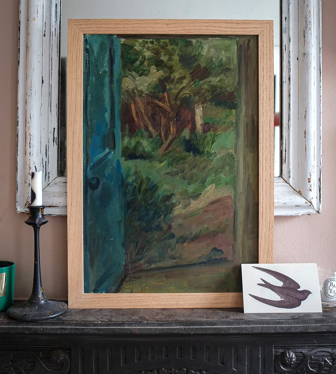 ‘The Garden Door’ is by British artist Bryan Whitfield (1935-2018). Whitfield was known as “the painter in the van” after several years travelling and working in France and Spain before returning to London, where he painted landscapes and studio still-lifes. The oil on canvas paper (shown below) dates to the 1970s and is painted in his trademark earthy tones of terracotta and vibrant greens, with teal and hints of ochre. Measures 55cm x 38cm. Available online.