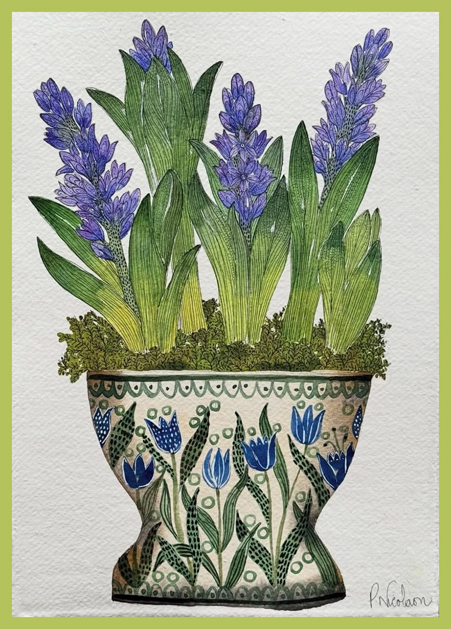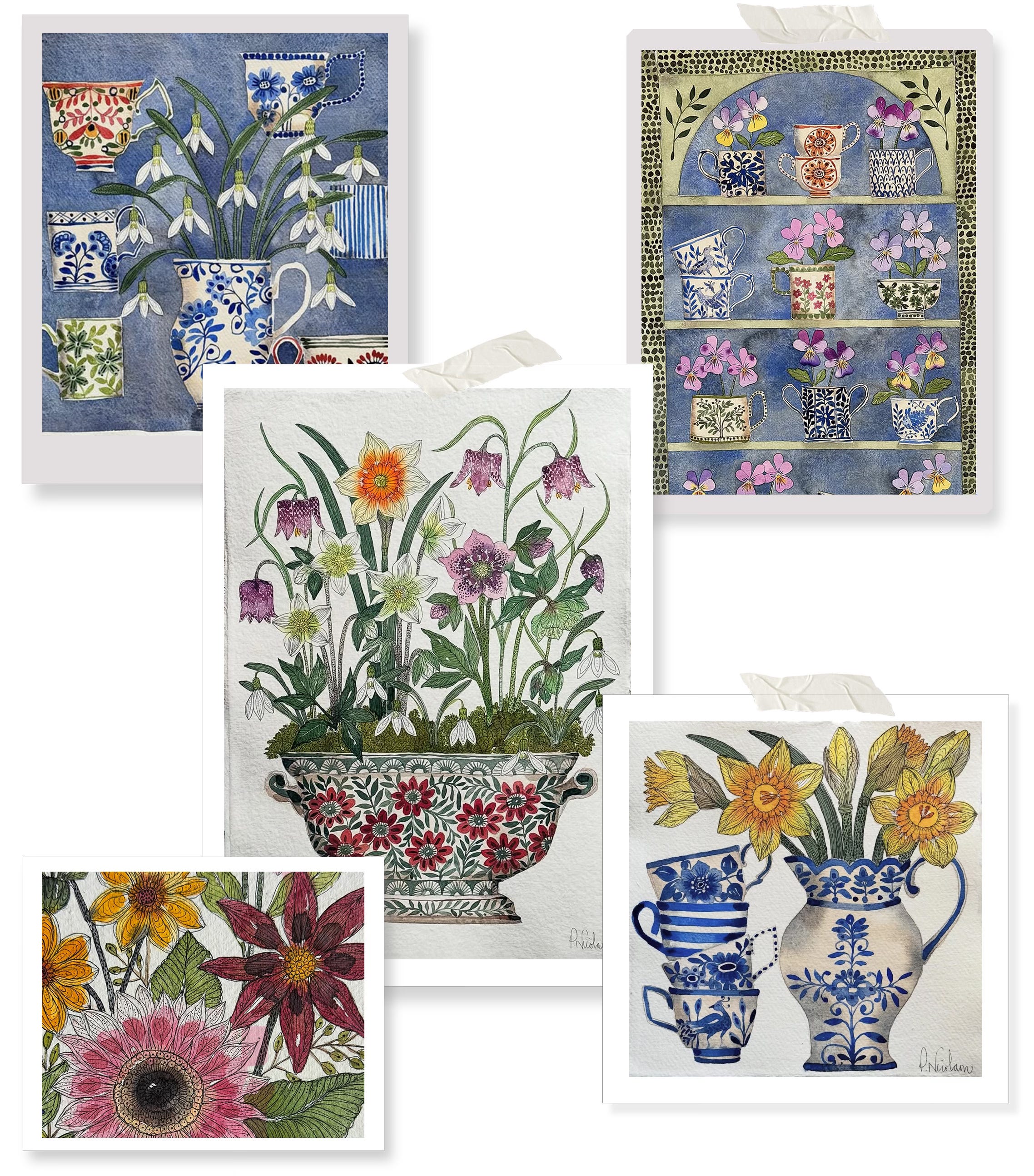 PM: My work reflects my love for nature, pattern and ceramics. I use pencil and watercolours to create flower and pottery paintings, adding a layer of black ink pattern detail with a very fine liner. I studied fashion design at university and fell in love with fashion illustration. After graduating I focused on my career and stopped painting for years. In hindsight the absence of art had a huge impact on my mental health and I only started drawing and painting again when I was pregnant with my daughter, 9 years ago. Then during lock down, time slowed down and I would paint day and night, which was beautifully meditative. That’s when my business really took off.