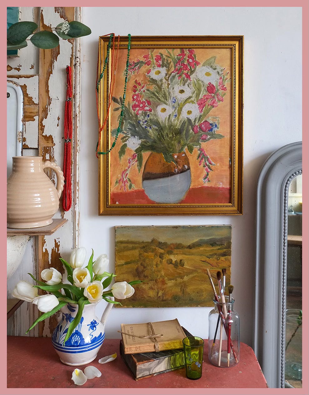 PM: I grew up on a smallholding and my mother is a potter so my upbringing has had a huge influence on what I am naturally drawn to and find inspiring. Flea markets, reclamation yards, car boot sales and antique shops played a big part in my childhood. I still love trawling vintage shops for old pottery treasures that I can use as inspiration for my paintings. My Grandmother was wonderfully green fingered and could make anything she planted flourish, her garden was beautiful and I still feel her presence in nature now. I love going on walks around Cheddar (where I live) and Somerset, the flowers and plants growing in front gardens or self seeded on walls always give me inspiration for what I will paint that day.