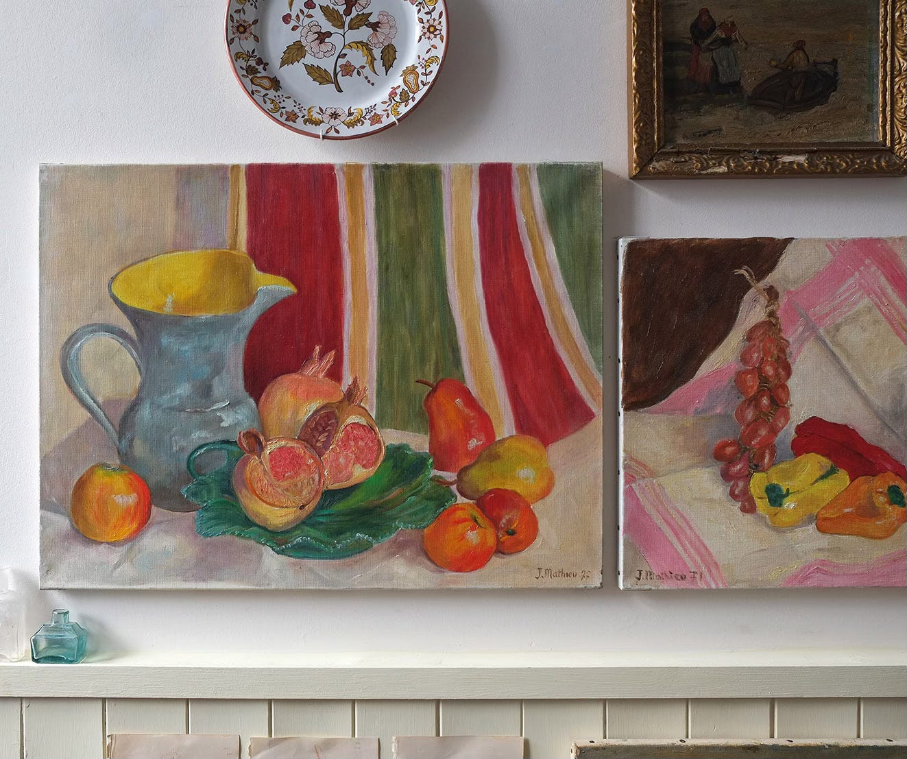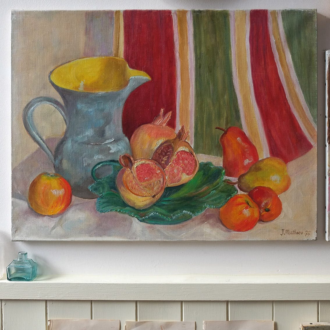 This vibrant still-life oil painting, Pomegranates, Pears & Oranges, features a still-life vignette set against a striped cloth background with a large water pitcher and green plate. The oil on canvas is vintage French and measures 61cm x 46cm. Signed J. Mathieu, 1977. A wonderful painting to add drama to any room. Available online at Mason & Painter.
