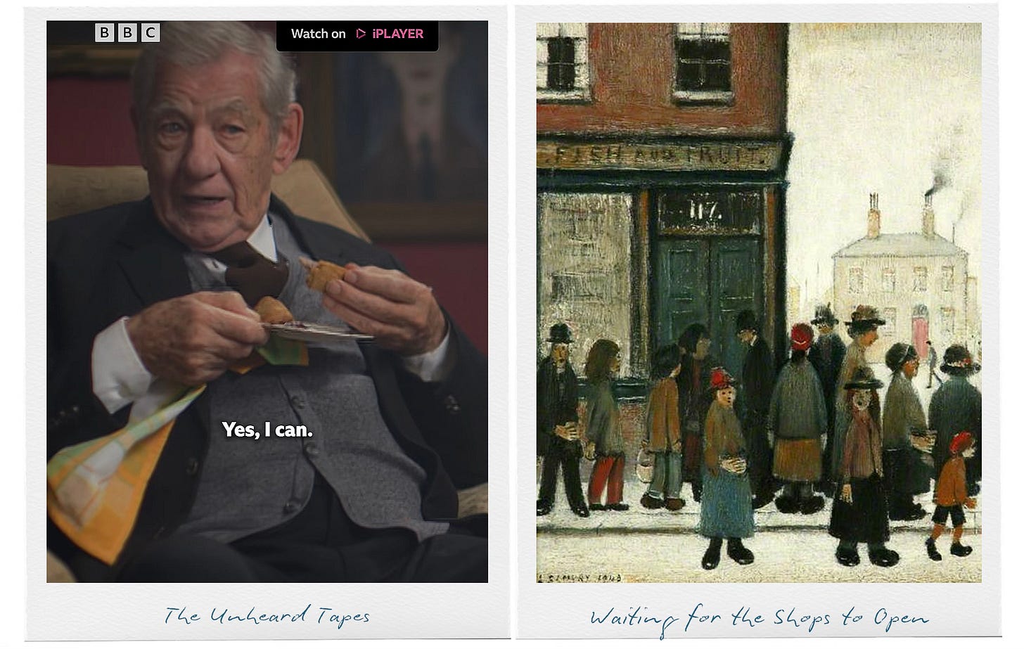 One of the best things I’ve watched on TV recently was LS Lowry: The Unheard Tapes, revealed through intimate taped interviews of the artist – “the matchstick man painter". The hidden, previously unheard tapes were recorded in Lowry’s Manchester home by a young fan, Angela Barratt in 1972, towards the end of his life. The tapes uncover much about the artist and the changing face of Britain. But what makes this film particularly remarkable are the two actors who lip-sync the real voices of Lowry and Angela, from the original tapes, and performed by Ian McKellen and Annabel Smith. A beautiful portrayal of an artist and fan and their unlikely friendship. Available to watch here on BBC iPlayer.